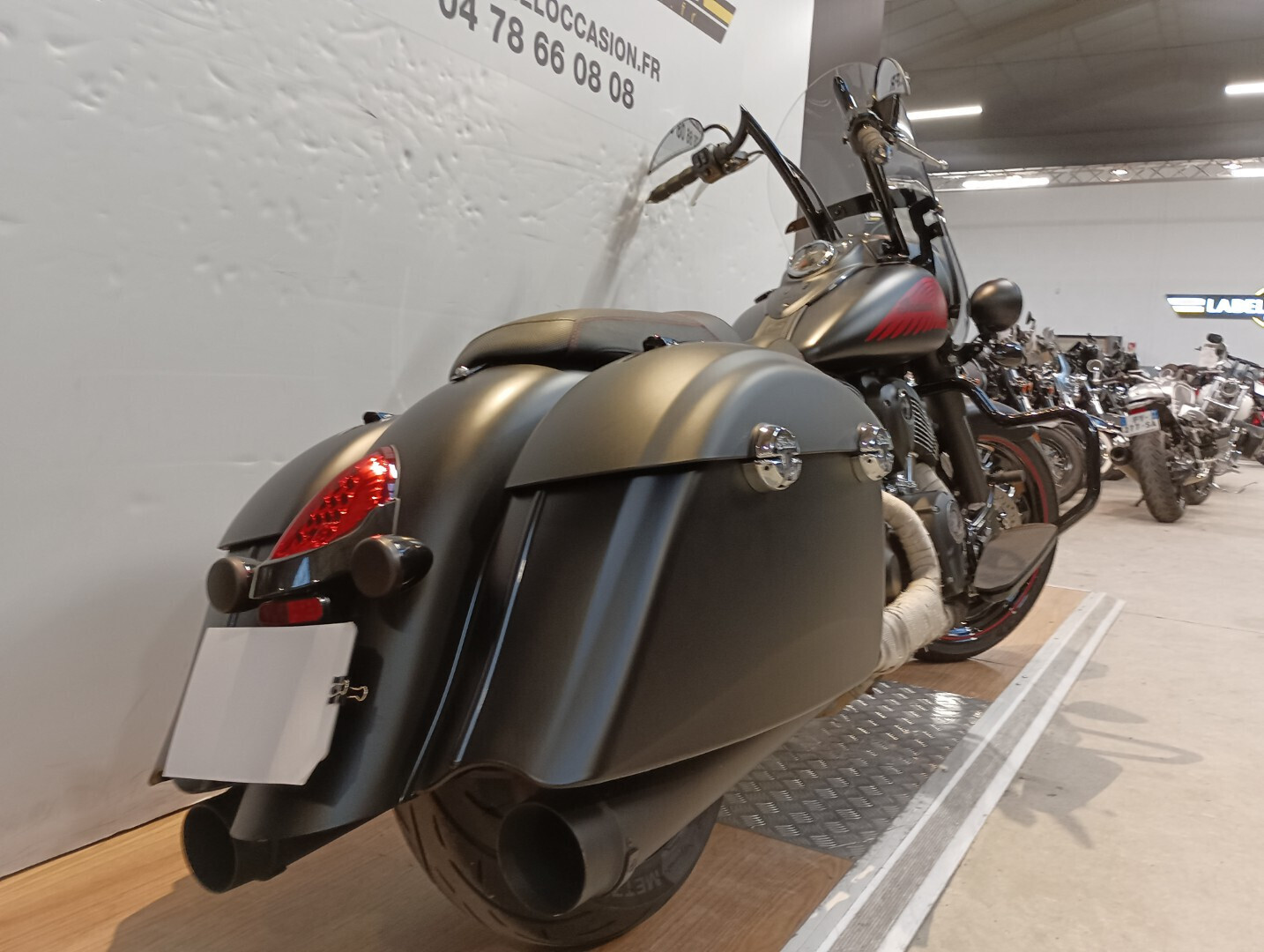 Options : Jantes 21", amortisseur Arnott (pneumatique), enceintes valises, feux avant les, pare brise, guidon ape hanger, échappements US, peinture personnalisée réservoir, selle confort Moillo, double sélecteur, filtre à air KN.